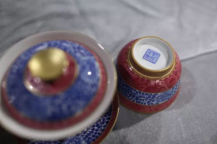 花映瓷灿文化交流展上展出的“乾隆年制”的故宫仿款瓷器,据介绍,这是按照一比一仿造的。张玉杰 摄