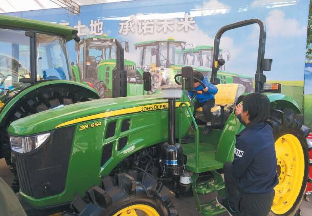 世界500强企业约翰迪尔的五六个系列的拖拉机也现身展区,从七八万元/台,到五六十万元/台,应有尽有。