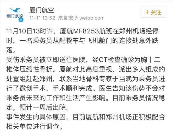 据了解,厦门航空MF8253航班11月10日12点58分,落地郑州新郑国际机场后,13点09分开舱,在配餐时二号乘务员13时20多分钟在从配餐车回机舱时从后舱跌落至停机坪。