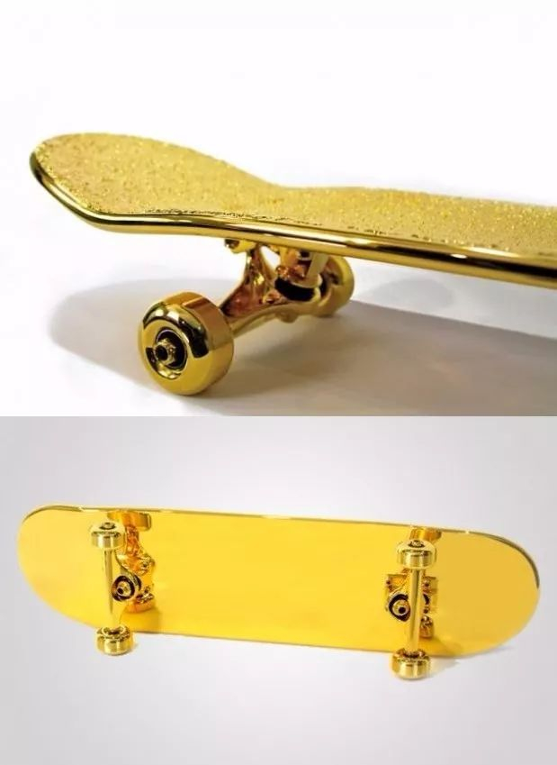 设计师马修·威利特为纽约一家滑板商店制作出一块表面镀有纯金的滑板。由于为纯金镀制,滑板表面看起来极为光彩夺目。尽管制作工艺十分精细,但丝毫不会影响到其正常使用性能。不过,由于比普通滑板重80%以上,可能在使用过程中更难控制。