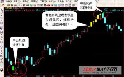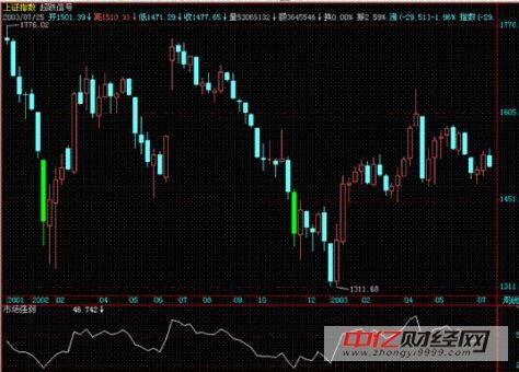 如图,2002年1月18日大盘出现绿色K线,说明大盘已经超跌,即将出现反弹,可以抄底抓超跌反弹行情。反弹行情的大小还是市场说了算——超跌的股票群越多,权重越大,反弹行情将越大。(下图的绿色K线为超跌信号)