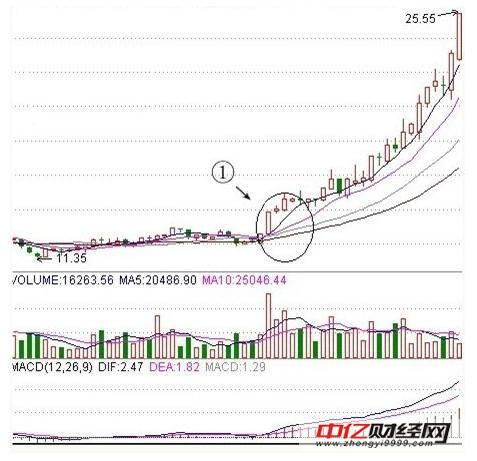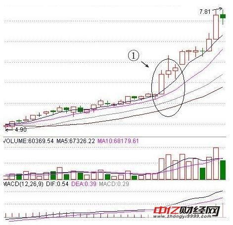 “均线多头排列”选牛股之1图中处,第一个涨停板,将该股带向了多头最强的攻击状态——均线多头排列,利用均线多头排列选股,可以让我们快速骑上短线飙升黑马股。目前很多软件都有这个选股功能,大家可以利用这个智能选股去挑选自己喜爱的个股。