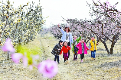 江苏无锡阳山镇桃花盛开时节,孩子们在老师带领下到桃林里观赏桃花。光明图片 |