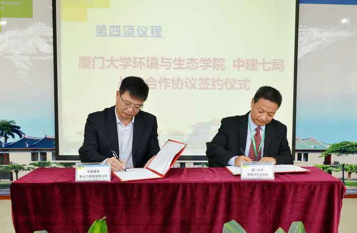 开幕式上,还举行了厦门大学环境与生态学院、中建七局战略合作协议签约仪式。仪式由厦门大学环境与生态学院党委书记沈小平主持,曹文志副院长、方胜利总经理分别代表两家单位进行了签约。今后,双方将本着优势互补、资源共享的原则积极开展合作,相信在双方的共同努力下,定能为省市地方的生态文明建设、为厦门市的海绵城市建设做出贡献。