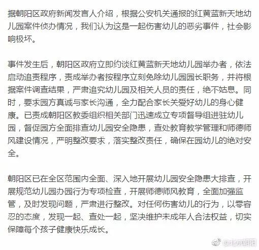 北京警方通报红黄蓝幼儿园事件:涉事幼儿园教师被刑拘