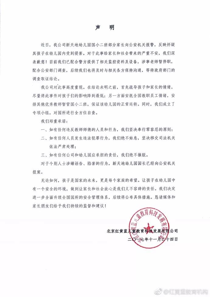 红黄蓝教育机构随后发布声明,开除涉事教师,免去园长职务。