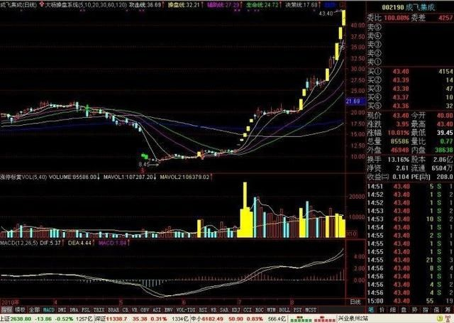 那些涨停的股票或者是短期内快速上涨的股票,在他们发起总攻的那一瞬间会出现异常的成交量,平时只有几十手的成交量水平,一旦股票开始快速上涨,成交量马上就变大几倍甚至几十倍,突然出来的大笔成交让我们都不约而同地认识到主力开始拉抬了,在分时图中留下了一根很长的成交量线,我们形象地叫它为“顶天量峰”。
