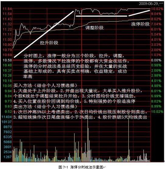 三、分时战法:分时图上,涨停一般分为三个阶段:拉升、调整、涨停。买入方法: