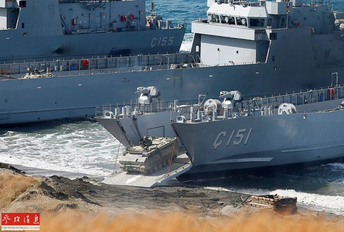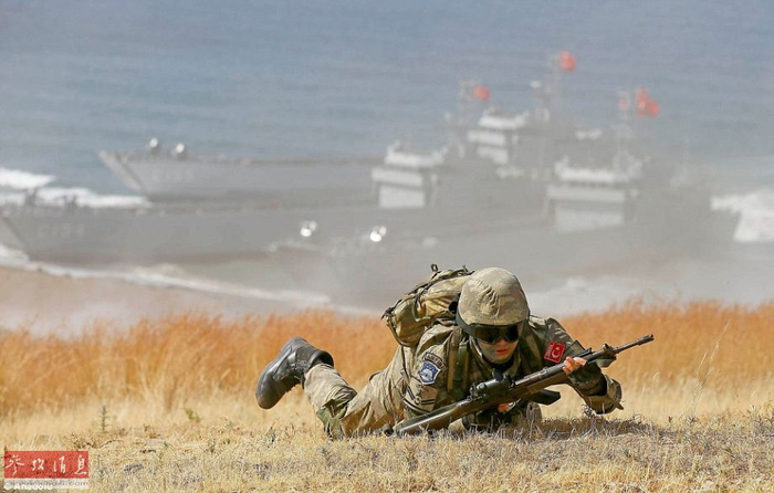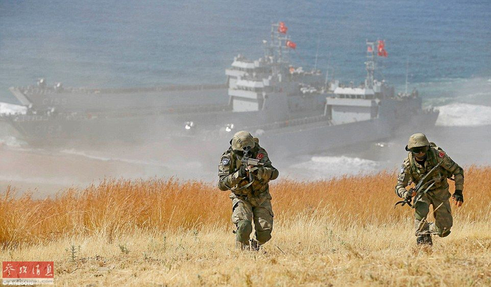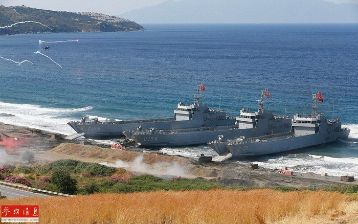 土陆军士兵在演习场占领高地,背景可见3艘土耳其海军坦克登陆舰。