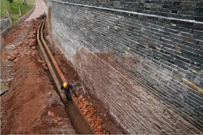 工人们正在对西昌老城墙进行修复改造