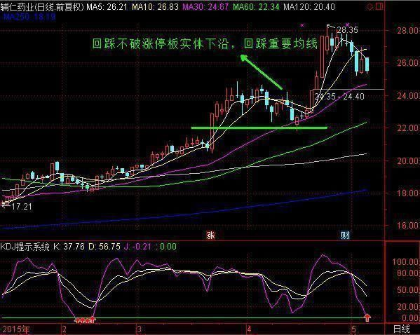 2、封涨停板之后,股价出现回调,不跌破涨停板阳线实体的下沿。