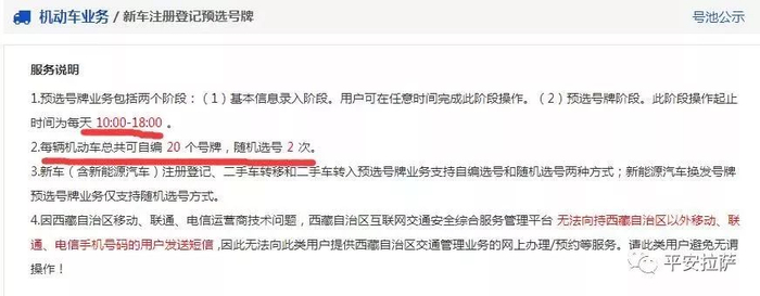 目前,拉萨网络预选机动车号牌服务只针对新购小型机动车,每天选号的时间段为——10:00-18:00,提供随机选号和自编号码两种方式。
