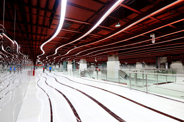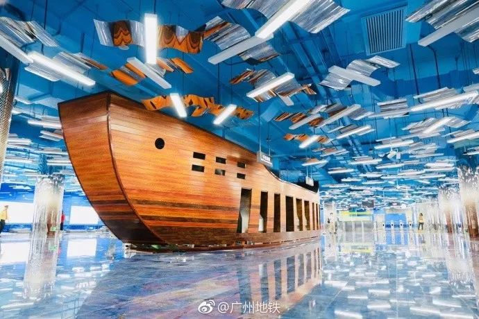 ▲四号线的南沙客运港站极具视觉冲击力。作为海上丝绸之路的起点,全站以“一带一路”为主线,全面融入海洋、宝船、海鸥等文化元素,重现了广州海上丝绸之路的历史盛景,全面实现整个车站的文化升级。