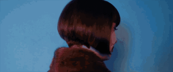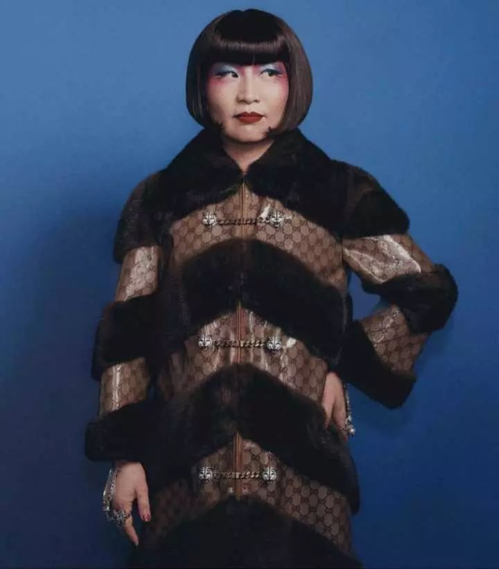 亮蓝色眼影、朱红嘴唇,一颗泪痣在油彩下若隐若现……她的五官并不出众,也不年轻,身着以Gucci的“双G”logo为底色、虎头链扣的大衣,单手叉腰,双眼瞟向一边……
