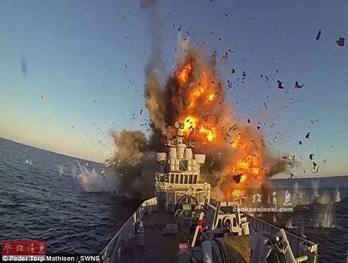 ▲图为NSM导弹首次实弹打靶的视频截图,可见导弹准确命中战舰中部,并引发剧烈爆炸。