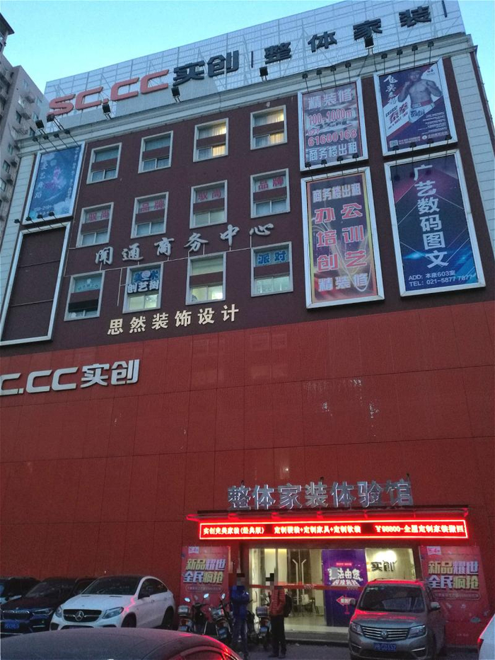 12月8日下午17时,记者来到浦东南路1630号“SC.CC实创整体家装体验馆”。体验馆门檐下还在闪亮滚动“实创完美家装(经典版)¥98800全屋定制家具搬回家,定制硬装+定制软装+定制家具”等字幕。自动门两侧依然竖着一人多高的“SC实创家装4周年”大幅广告。广告前,停了4辆标记“潍坊”、“治安巡逻”等字样的带警灯的电动自行车。