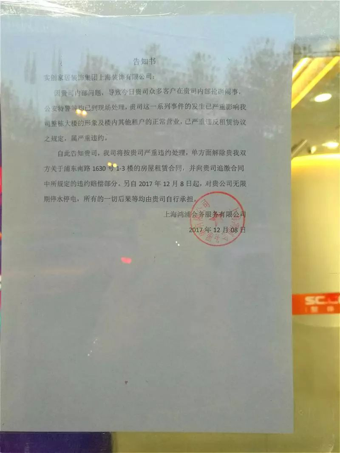 记者上前,看到自动门上贴着一张A4纸篇幅、由上海鸿浦会务有限公司当天发布的《告知书》,大致内容是“实创上海公司”一系列事件的发生已严重影响整栋大楼的形象及楼内其他租户的正常营业,鸿浦公司解除双方关于浦东南路1630号1-3楼的房屋租赁合同。