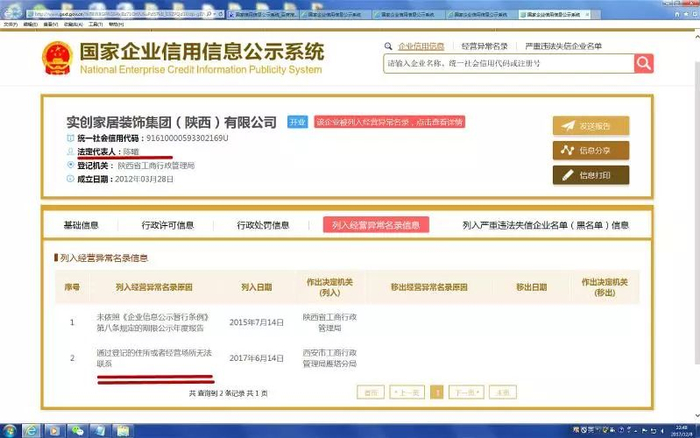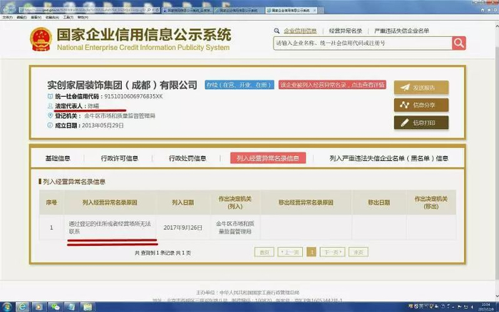 实创(陕西)有限公司、实创(成都)有限公司分别于今年6月14日、9月26日被列入“经营异常名录”,原因都是“通过登记的住所或者经营场所无法联系。”