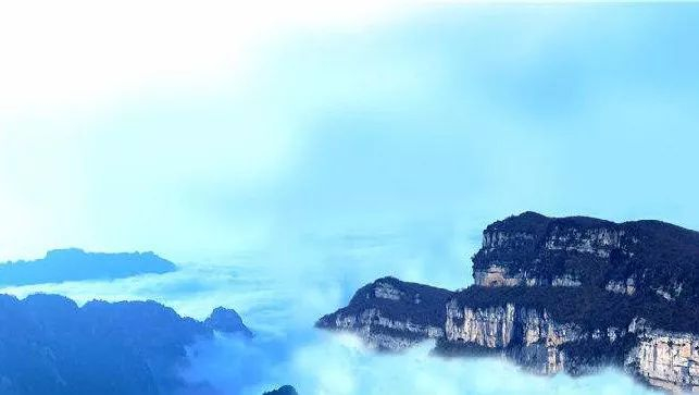 登到山顶向下俯瞰,山间白茫茫一片,映衬着湛蓝的天空,阳光的映射下,整座山体闪着洁白透彻的微光,清秀雅致,摄人心魄……