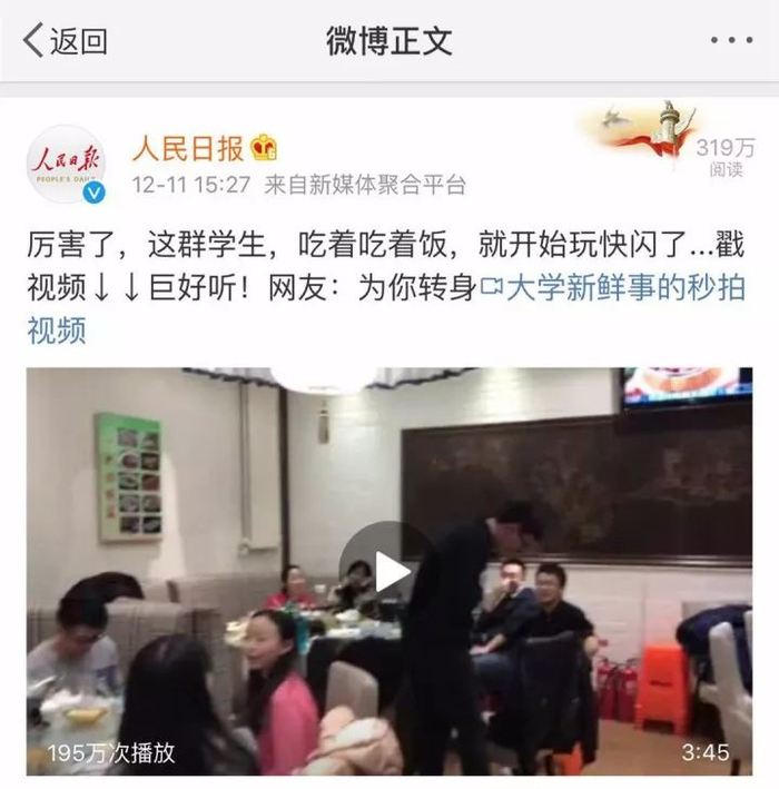 编者按:在餐厅里,这群学生吃着吃着,突然玩起了快闪……现场拍摄的视频令网友大呼感动,看完视频的原唱汪峰甚至在微博“求联系”,邀请他们上演唱会!