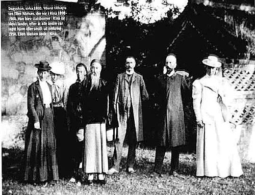 1910年,丹麦人与中国同事在大孤山留影。右一是聂乐信小姐,在她身旁的是丹麦牧师柏卫先生,左一系其夫人米娜,左二是丹麦教士郭慕深Karen Gormsen小姐,系安东基督教女子医院及育婴堂的创立者。