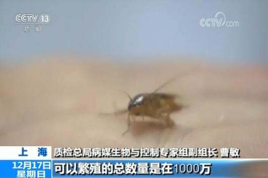 质检总局病媒生物与控制专家组副组长 曹敏:蟑螂能传播很多病原体,像黄曲霉素毒素它是一个很强的致癌物,在蟑螂的身上能够检测到它的携带率到30%。一只蟑螂经过一年可以繁殖的总数量是在1000万,在没有爸爸的情况下,雌体蟑螂它也能够繁衍后代,这个蛮可怕的。