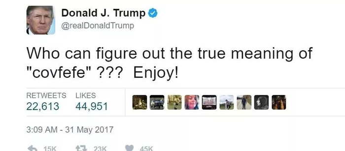 关于这个词是什么意思的提问,白宫官员高举挡箭牌,就连出字典的韦氏出版公司也说不出个所以然。特朗普则把他想表达的意思留给了读者去猜测。他在一条后续推文中写道:“谁能猜出‘covfefe’的真正意思?尽情享受吧!”