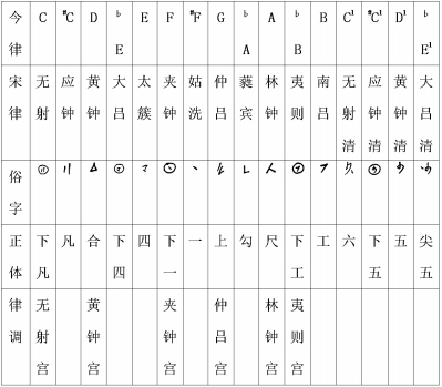 唐燕乐之器乐半字谱至宋统一用筚篥谱字,即燕乐俗字谱,以草体工尺字标写,共十六字表示今之C、D、F等音高,现存宋代词乐乐谱即为这种固定唱名的俗字谱。宋代词乐总谱《乐府混成集》早已散佚,幸有明王骥德《曲律》存只言片语。元刊《事林广记》中载唱赚谱一套,有谱无词,计有【愿成双令】【愿成双慢】【狮子序】【本宫破子】【赚】【双声子急】【三句儿】诸曲。宫调标为黄钟宫,乃律调名,实为正黄钟宫,即正宫。