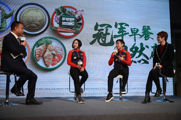 世界冠军隋文静、韩聪与主持人沙桐(左)、纽崔莱营养师李冬艳座谈