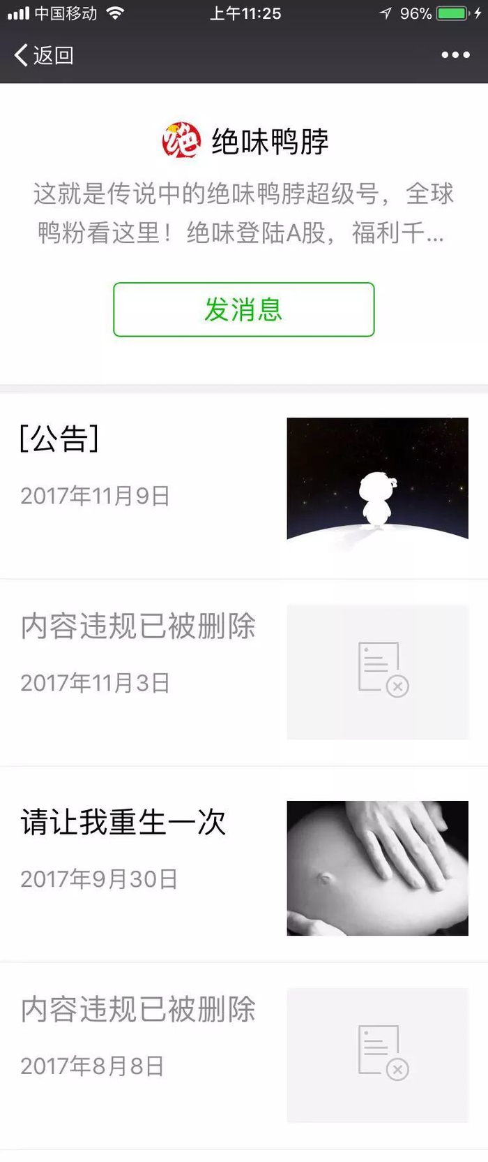 今天,广州参考编辑查阅绝味鸭脖公号历史消息发现,据微信页面显示,11月3日、8月8日发布的内容因“涉及低俗、性暗示或色情信息”已被删除。