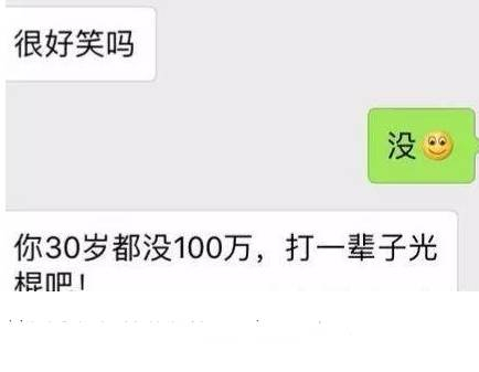 “聊了一会,小姑娘直接对我说不合适,以后别联系了,我想着不合适就不合适吧,反正这样的女孩我也伺候不了。”刘先生继续说,可能感觉到自己也无所谓了吧,女孩最后直接怼了句“你30岁都没100万,打一辈子光棍吧”,让他觉得可气又好笑。
