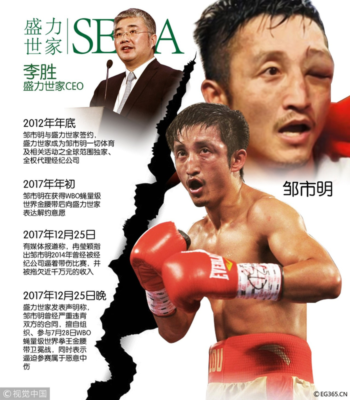 “2017年,邹市明严重违反双方《经纪代理委托合同》(“经纪合同”),擅自组织、参与7月28日WBO蝇量级世界拳王金腰带卫冕战。