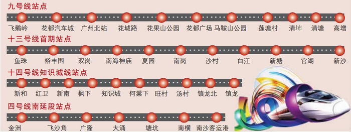 昨日,广州地铁集团发布消息称,四号线南延段、九号线一期、十三号线一期和十四号线知识城支线定于明日开通试运营。