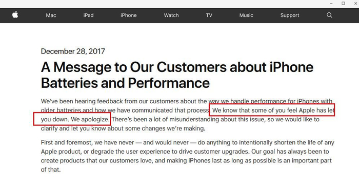 今日(12月29日)早间,苹果公司发布声明称,已经了解到用户对于苹果在老款iPhone“降速门”事件中的反馈,并表示:“我们知道你们中一些人觉得苹果让你们失望了,我们深表歉意。”