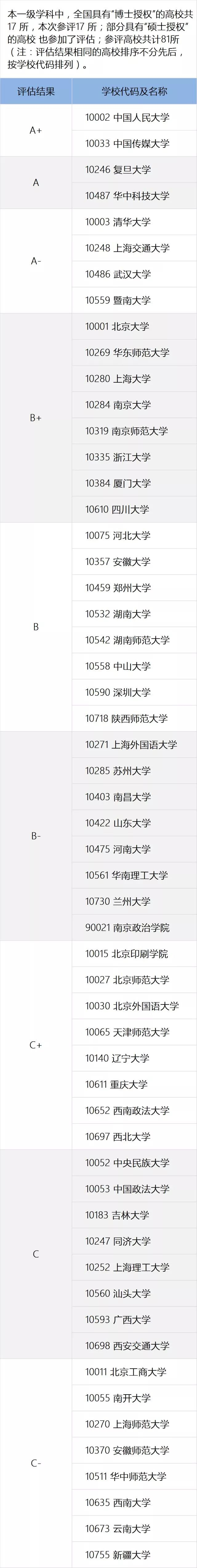 和上一轮学科评估不同的是,这一轮的结果不是以排名来呈现的,而是以等第制的方式呈现,根据全国具有“博士授权”资格的高校一级学科的参评数,经评估后获得A+、A、A-、B+、B、B-、C+、C、C-等不同的等级。清华大学和北京大学优势明显,清华大学有21个学科获得A+。