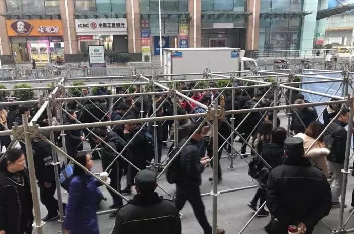 八佰伴门口装上了人形隔离设施,由民警和工作人员引导确保有序。