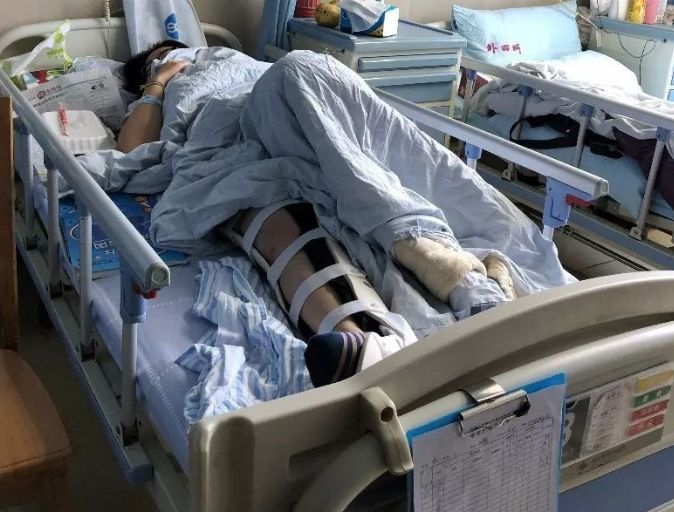 1日上午,记者在广州四五八医院看到了卧床的刘小姐。她的右腿被夹板固定着无法动弹,右大腿外侧有一大块擦伤痕迹,大腿淤伤明显。而左上臂也因落地时碰撞而导致一片淤青。“现在右脚动不了,还隐隐作痛。”刘小姐称事发时,她只感觉到一阵剧痛,“有车轮在腿上压过的感觉。”