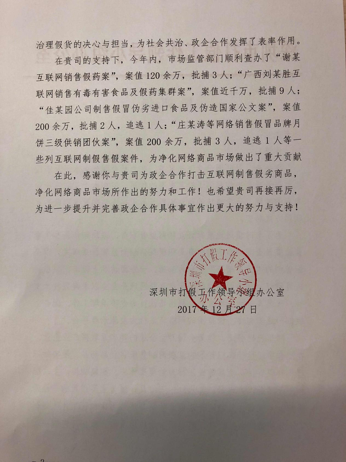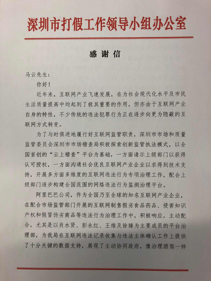 “马云先生,你好!”在2018年的第一个工作日,阿里巴巴收到了有关深圳市打假工作领导小组寄来的感谢信。在信中,深圳打假工作小组梳理了四起涉案过百万的打假案件,感谢阿里积极配合市场监管部门打假。