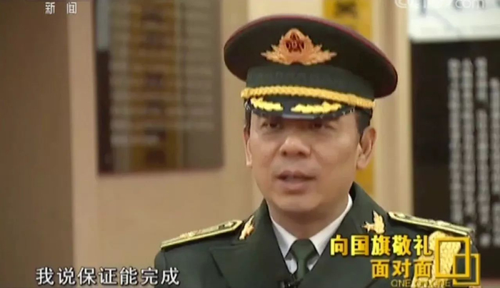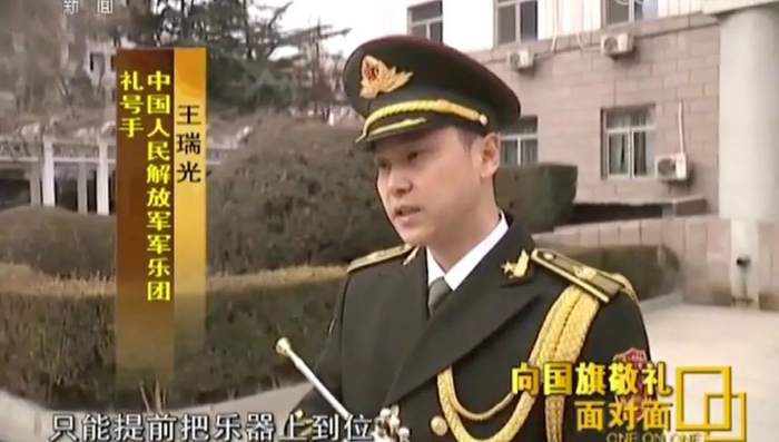 因为按升旗按钮有个距离时间,所以当时仪仗队就提出来说,国旗晚了。我说那再来一遍,“向国旗敬礼——”我打了4拍正好了。所以第2次预演的时候严丝合缝了,我们就按这个4拍走。