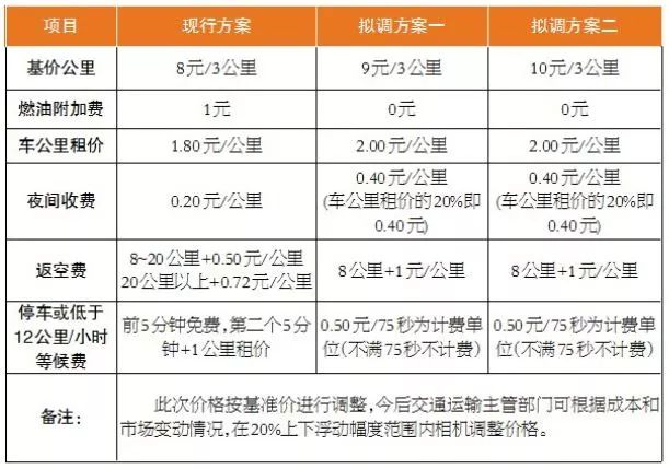 两种方案都将燃油附加费并入运价,起步价由3公里8元,分别调至3公里9元、3 公里10元。