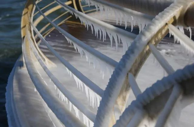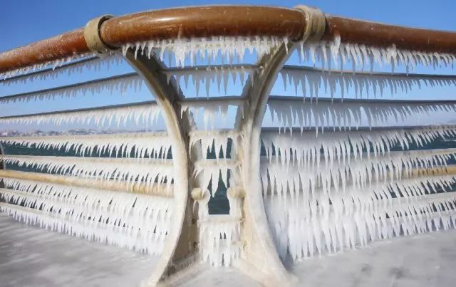 东港商务区木栈道护栏再现 " 冰瀑 " 美景