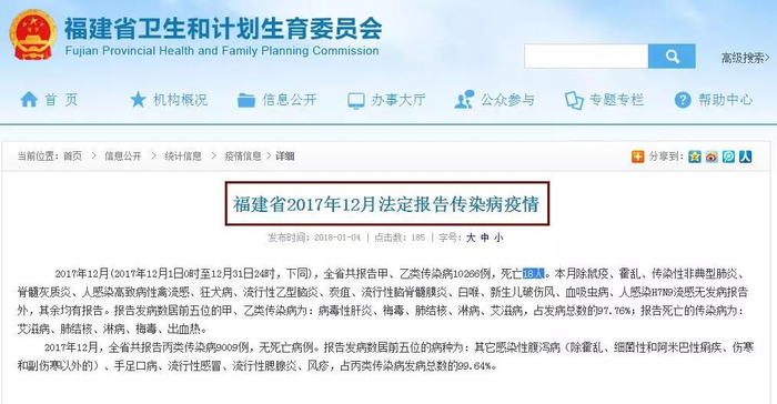 日前,福建省卫计委公布福建省2017年12月法定报告传染病疫情,信息显示: