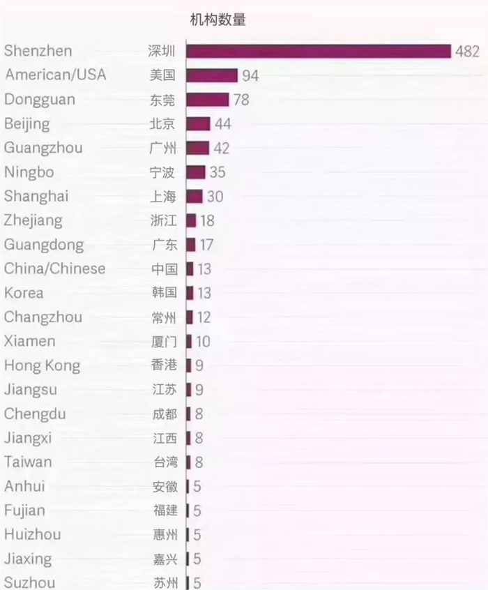 有统计显示,从公司名所示的地点分析,中国企业当之无愧的成为第一军团:深圳(482家)大幅度优势拔得头筹、美国(94家)尾随其后,东莞、北京、广州分列其后。