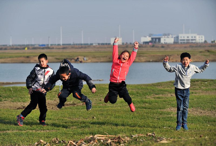 昨天,武汉天气晴暖,几个小朋友在府河滩涂的草地上开心地玩耍 记者李永刚摄