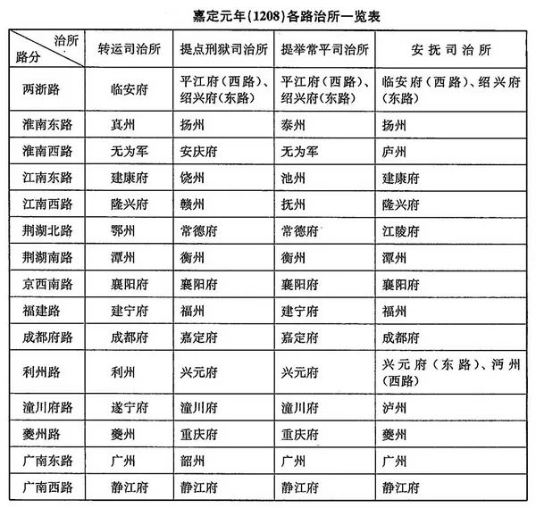 南宋嘉定元年各路治所一览表