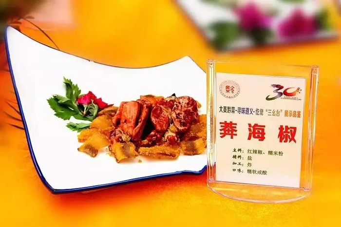 务川仡佬“三幺台”:天星米麻饼、荞麦皮、蕨根包子、巴山豆粉卷、翡翠豆腐、香辣绿豆粉皮、尖椒马口鱼、山羊肉鲊、白果炖鸭、莽海椒、全锅山羊肉、野生黑大脚菇汤、蒜香灰豆腐、泡味拼盘。