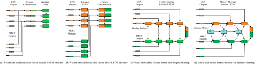那么如何更合理地利用视听觉信息?课题组提出并分析了三种视听觉特征深度融合框架(如图1所示),第一种为将视听觉信息简单并连在一起,第二种在视听特征编码阶段共享LSTM内部记忆单元,建立视听模态间的短时依赖性,第三种在视听特征编码阶段共享外部记忆单元,建立视听模态的长时依赖性。