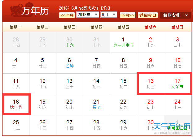 2018年端午节是6月18日星期一。2018年端午节放假安排:6月16日-6月18日,共放假3天。