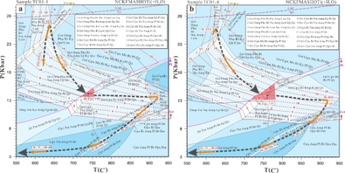 图1.班公湖-怒江带洞错地区榴辉岩的相平衡模拟及P-T轨迹