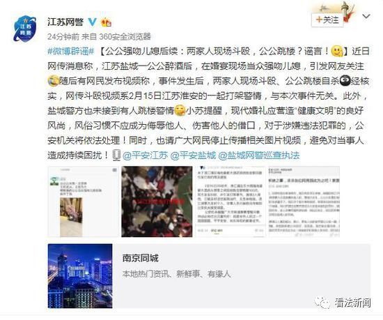 视频传开后,曾传出“新郎打了公公”、“公公跳楼自杀”、“引发男女双方群殴”等言论,对此,江苏警方已进行辟谣。